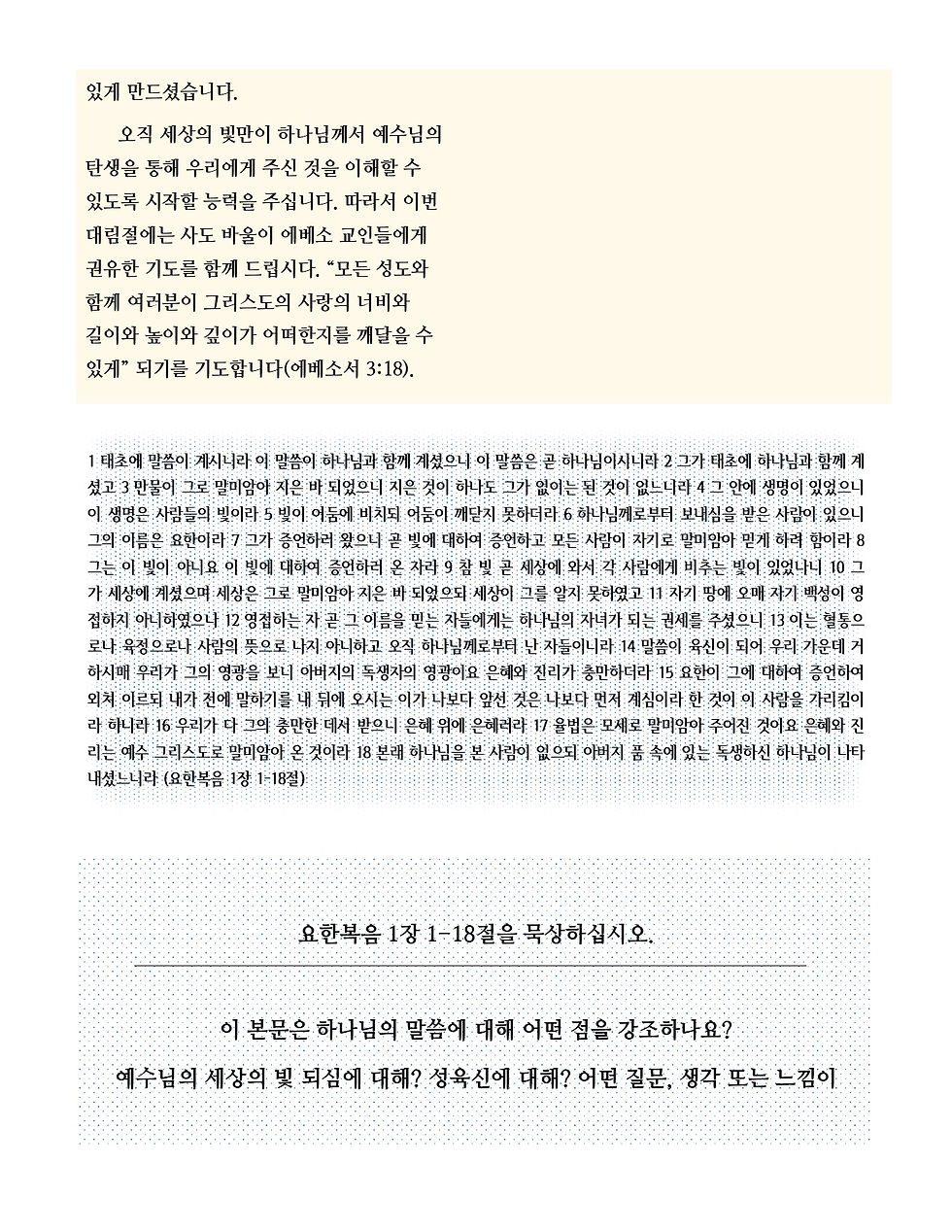 “사랑의 나눔 있는 곳에 하나님께서 계시도다” 라는 찬양이 있습니다. 짧은 가사를 반복하며 나눔을 실천하고 하나님을 경험하고자 프랑스 떼제 공동체에서 시작했다는 찬양입니다. 입술로 찬양하여 사랑의 나눔을 실천하고자 다짐하는 것만으로 하나님의 사랑이 충만해 지는 것 같습니다. 여러분, 나눔을 실천함으로 하나님의 사랑을 서로 경험하기를 간절히 기도합니다.